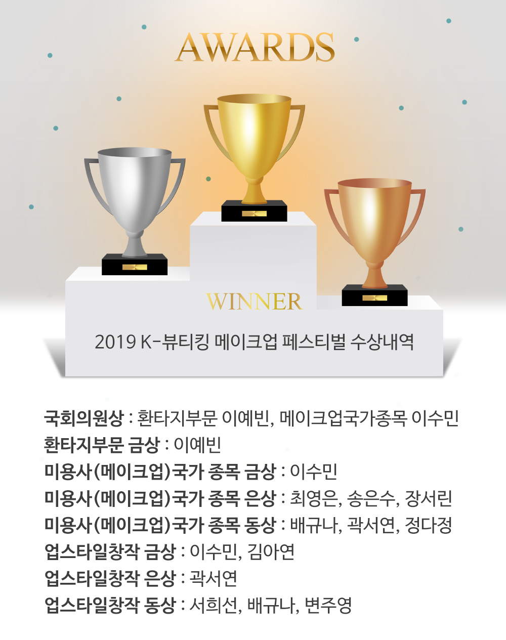 서울예술실용전문학교 뷰티과정 학생들이 KBS 아레나홀에서 열린 제 12회 K뷰티킹 메이크업 페스티벌에 출전해 대거 수상했습니다! K뷰티킹 메이크업 페스티벌은 오랜시간 동안 지속되온 대회로 헤어, 네일, 피부, 메이크업 등 뷰티의 전 분야를 아우르는 대회인데요. 뷰티를 전공하는 학생들과 전문가들이 겨루며 자신의 실력을 입증하기 위해 참여하는 대회랍니다. 이번 K뷰티킹 메이크업 페스티벌은 메이크업, 헤어, 네일, 스킨아트, 피부, 왁싱 등 총 6개 부문으로 진행되었는데요. 국회의원상까지 받으며 본교 재학생들의 활약이 돋보였답니다. 아래 수상 내역부터 알아볼까요?