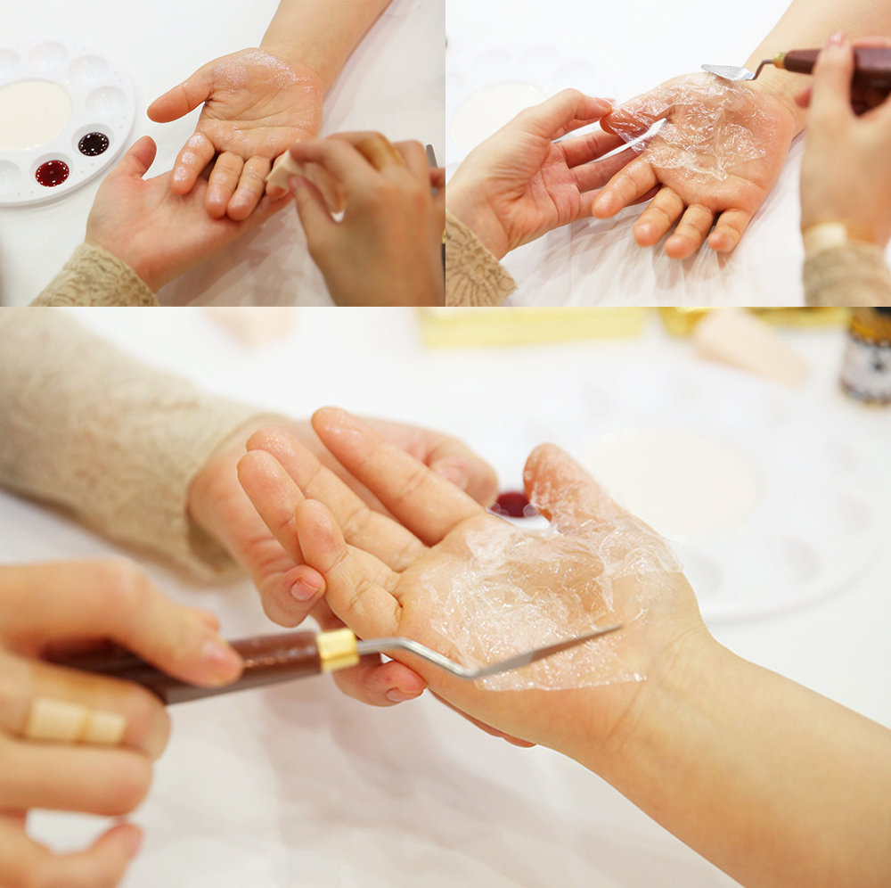 그럼 이번 포스팅으로 간략하게 손 화장 특수분장에 대해 배워볼게요. 라텍스로 한 번 피부가 벗겨진 것을 표현을 해주고, 오브라이트를 구긴 뒤 손바닥에 붙여 화상 피부를 표현해줍니다. 이때 족집게를 사용해 피부에 밀착해줍니다.