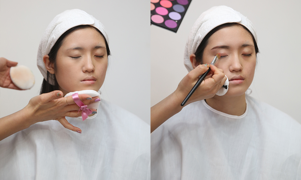 2. 모델 피부색에 맞는 톤에 맞춰 얼굴 안쪽에서 바깥쪽으로 파운데이션을 펴서 발라주세요. 전체적으로 펴서 바른 다음 커버가 필요한 부분에는 한 번 더 발라주세요. (주의! 결이 생기지 않도록 브러쉬와 퍼프를 이용해주세요.)