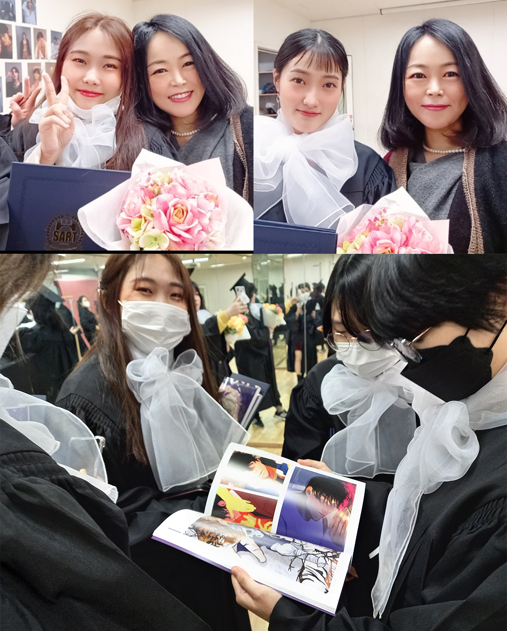 코로나로 인해 졸업식이 취소되었지만 학생들은 졸업 전시회 도록과 졸업 증명서를 받기 위해 정해진 날짜에 삼삼오오 학교에 모였답니다. 몇몇 학생들은 포토월에서 졸업 사진을 찍고 졸업 전시회 도록을 나눠 보며 지난 시간을 돌아보았답니다. 코로나로 인해 졸업식이 취소되어 아쉬웠지만 그래도 마지막에 기념 사진도 남기며 잠깐이나마 추억을 만들 수 있었답니다.