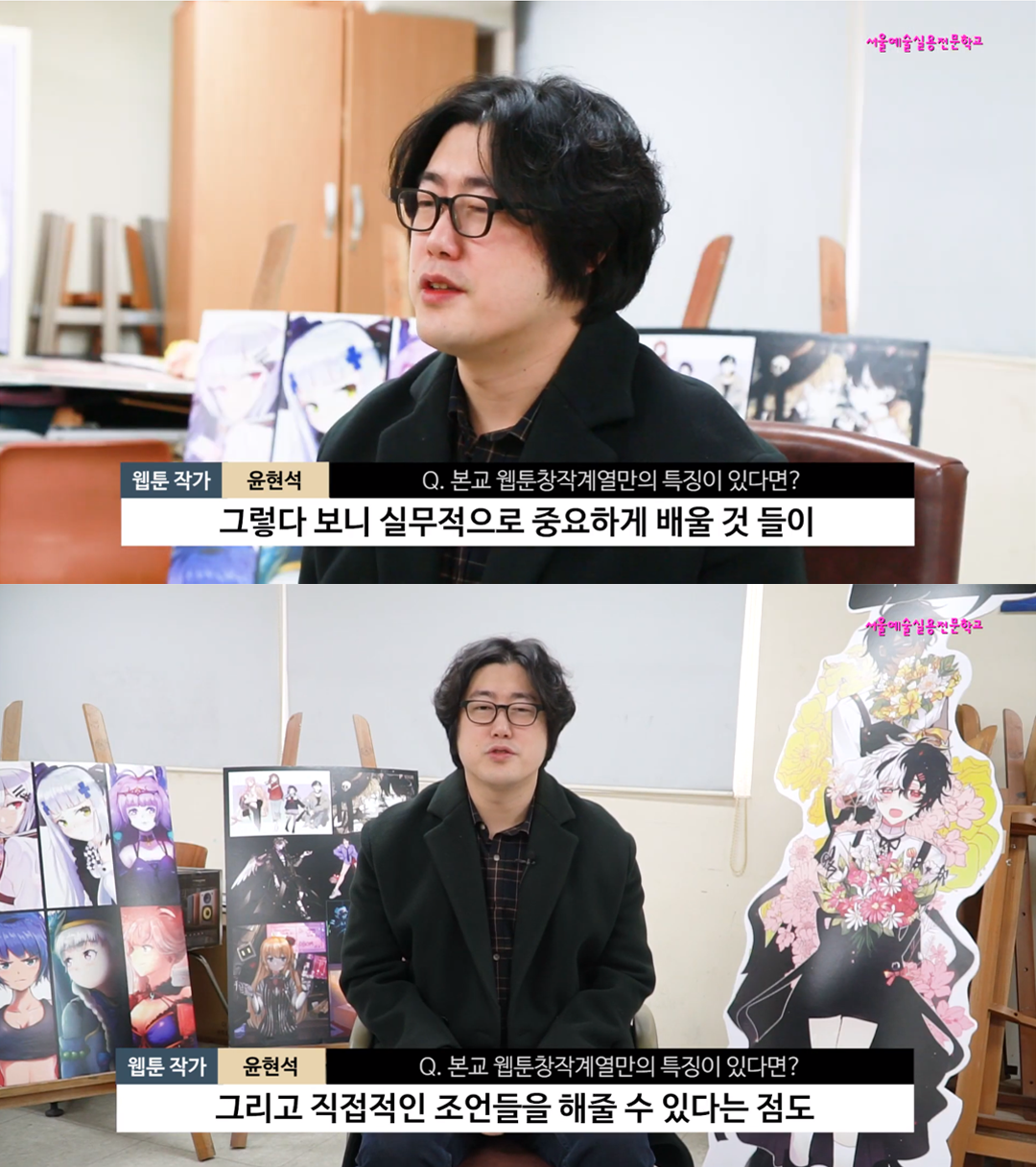 현재 웹툰의 추세가 어린 나이에 프로로 뛰어드는 친구들이 많은데요. 그러다 보니 실무적으로 중요하게 배울 것 들이 많이 필요하다고 생각합니다. 본교에서는 웹툰을 그리는데 필요한 직접적인 교과과정이 잘 갖추어져 있고 많은 교강사님들께서 창작외 실무적인 조언을 해줄 수 있다는 것도 장점이라고 생각합니다.
