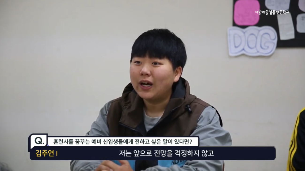 김주연 : 아무래도 이제 반려동물 시장이 점점 커지고 있는데요. 만약에 반려동물 훈련사나 미용사나 사육사를 꿈꾸는 학생들이 있다면 저는 앞으로 전망을 걱정하기 않고 충분히 도전할 만한 가치가 있다고 생각합니다. 자신이 동물을 좋아하고 자신이 2년 동안 진짜 많은 공부를 해서 필드에 나가서 많은 동물들한테 도움을 주고 싶다면 주저하지 말고 도전했으면 좋겠다고 말하고 싶습니다.