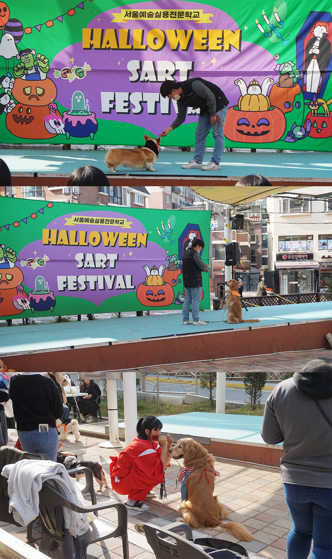 애완동물계열에서는 할로윈 코스튬 패션쇼가 열렸습니다. 강아지들이 할로윈 코스튬을 입고 런웨이 무대에 등장했는데요. 애완동물계열 학생들이 펫 코디 수업에서 만들어준 옷을 입고 등장하기도 했습니다. 귀여운 강아지들의 장기와 함께 행사장의 분위기가 업!