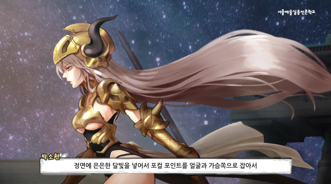 다음은 여성 갑옷 컨셉 작품입니다. 평소에 그림을 그릴 때 캐릭터를 세워놓고만 그림을 그렸지 역동적인 자세를 그려본 적이 없어 역동적인 자세로 그려볼까 하고 시작한 작업이라는데요. 정면에 은은한 달빛을 넣어서 포컬 포인트를 얼굴과 가슴쪽으로 잡아 시선이 다른 곳으로 분산되지 않고 캐릭터의 얼굴과 갑옷의 질감에 더욱 집중이 잘 되게끔 작업을 했다고 합니다.