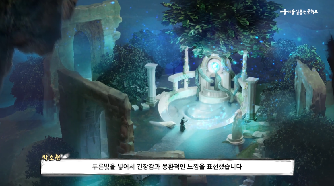 다음은 3D 유적지와 캐릭터 작업입니다. 이 씬은 한 남자가 숲속을 헤매던 중에 오래된 유적지를 발견하고 후에 무슨 일이 생길 것 같은 느낌을 주는 장면인데요. 푸른 빛을 넣어 긴장감과 몽환적인 느낌을 표현했다고 합니다.
