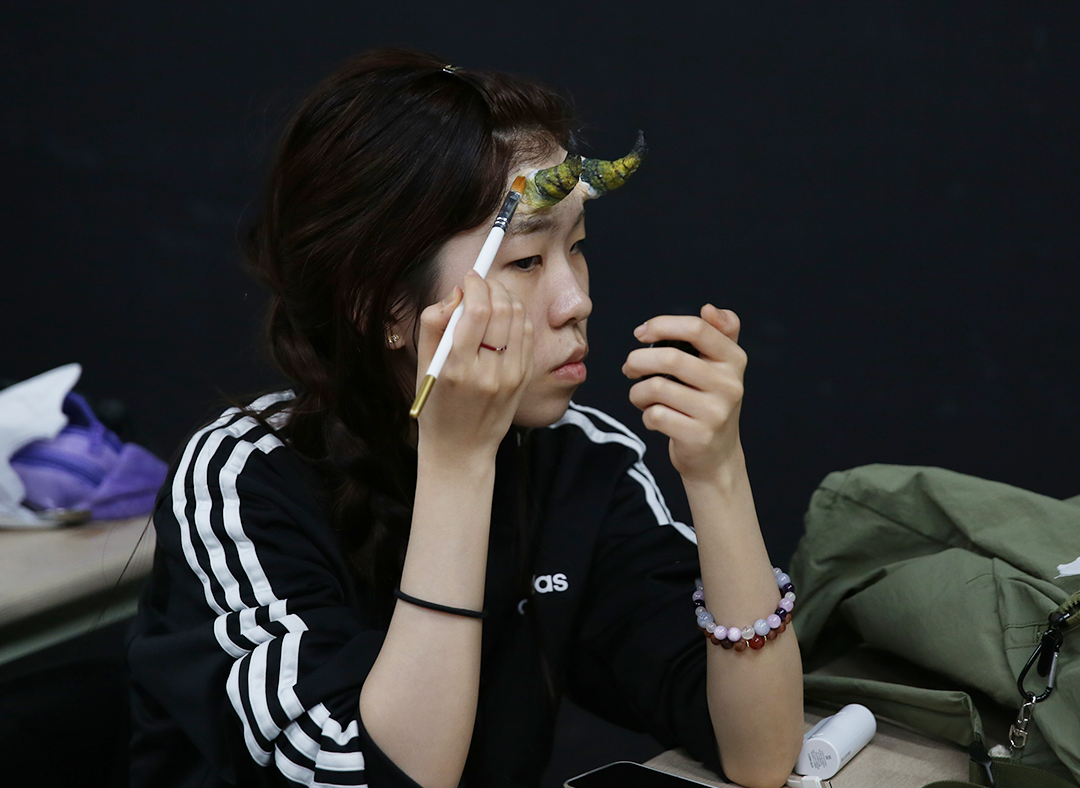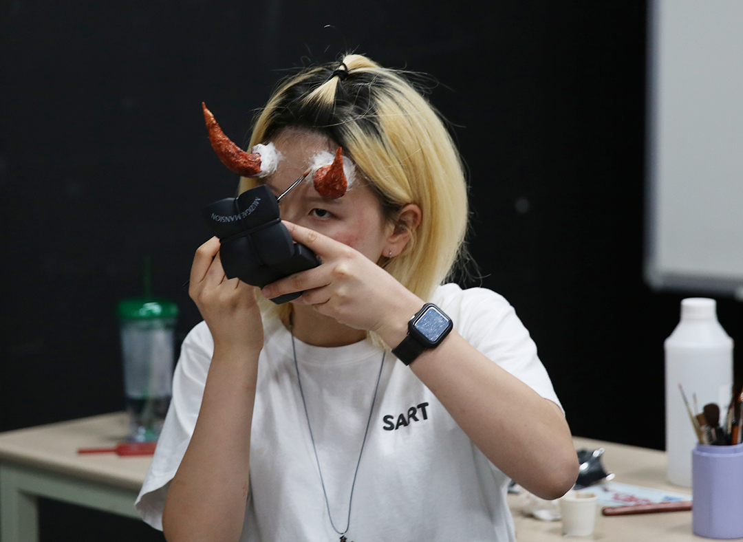 상처 분장 수업에 이어 뿔 분장 수업도 이루어졌는데요. 뿔은 자연스럽게 피부에 부착하는 방법부터 표현하는 방법까지 학생들이 현장에서 활용할 수 있는 팁들을 아낌없이 알려주었습니다.